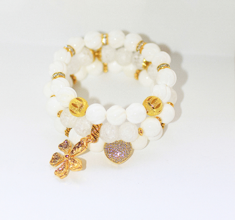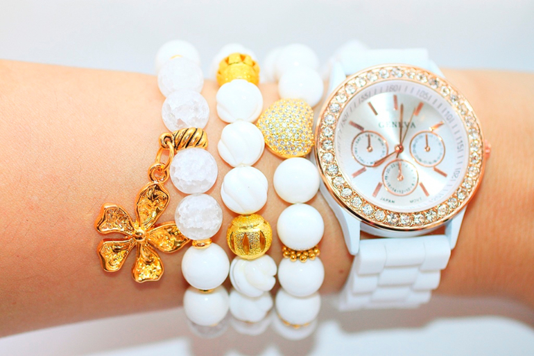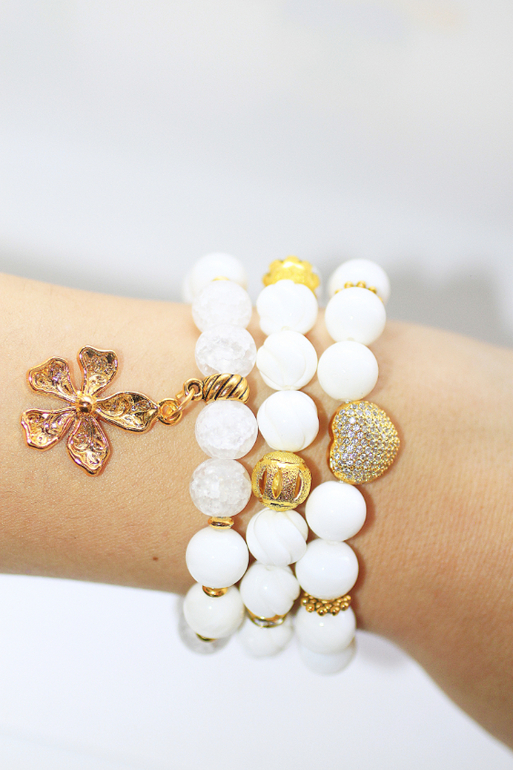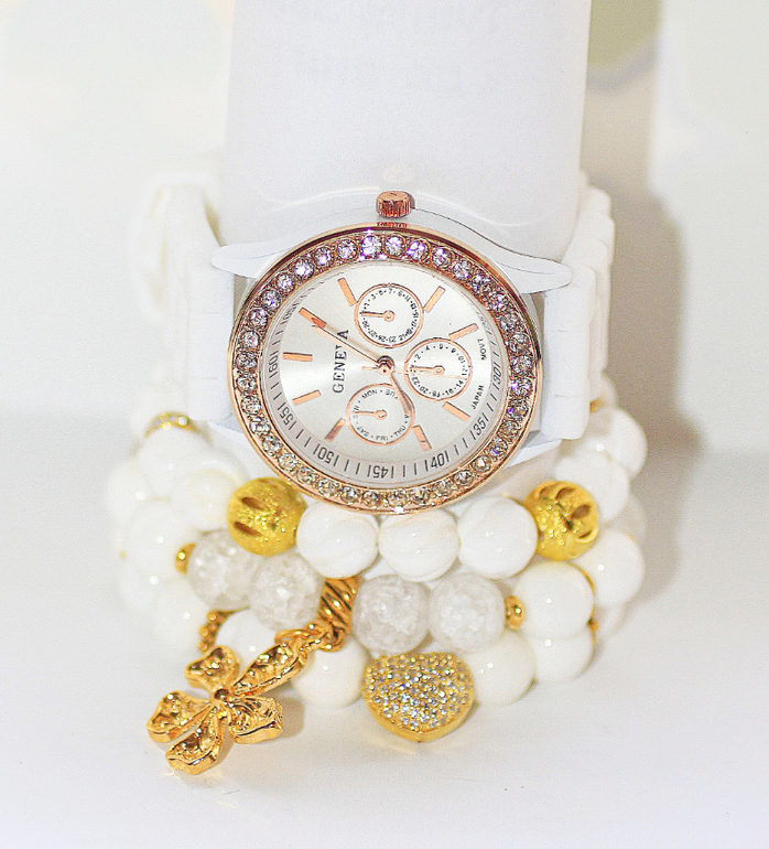 Бижутерия для слингомам. Слингобусы. Грызунки.Красивый комплект из белого агат и снежного кварца, с кварцевыми часами на силиконовом ремешке и фурнитурой класс LUX