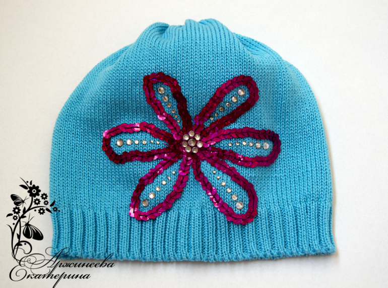 Связалась у меня сегодня позитивная, яркая шапочка расшитая пайетками и украшеная стразами, пряжа 100% хлопок, 44-48 см.