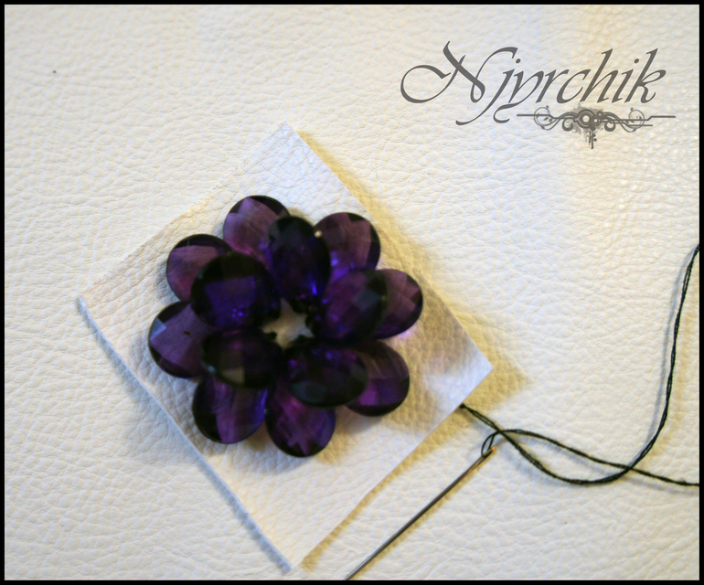 4. Пришиваем в серединку круглую бусину. Пришивая бусины я не отрезала каждый раз нитку, но делала после каждой пришитой бусины узелок