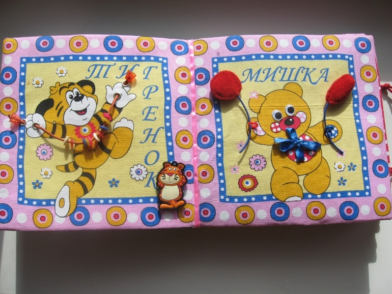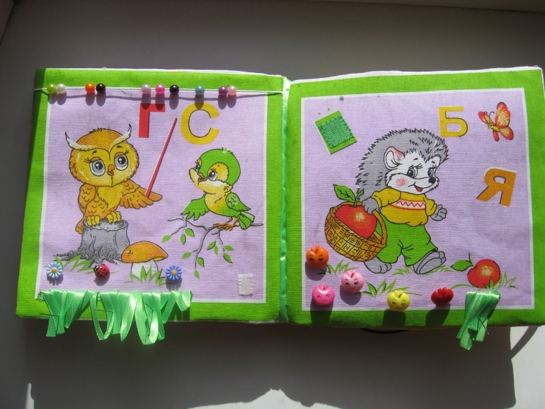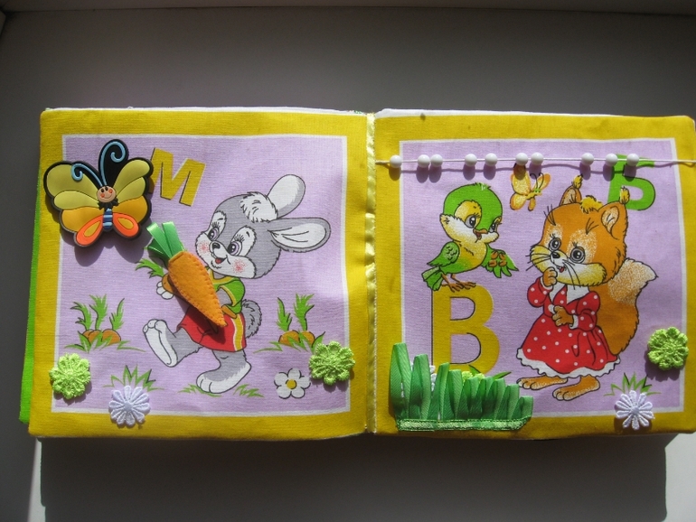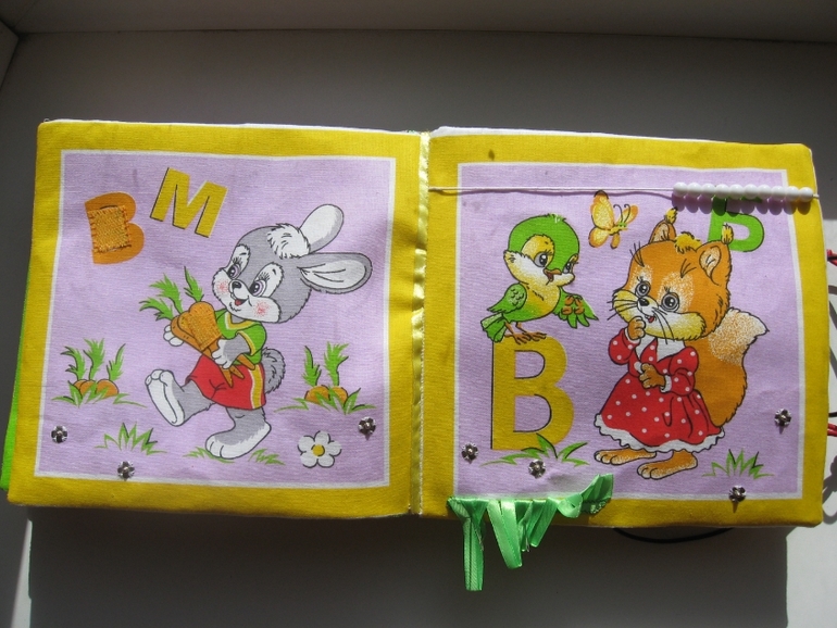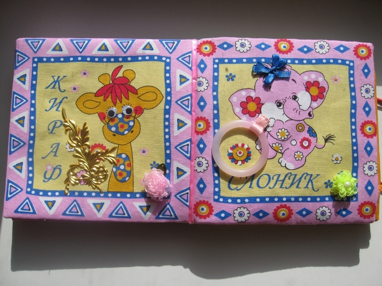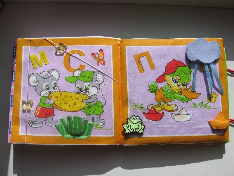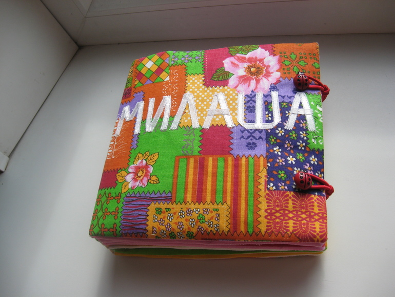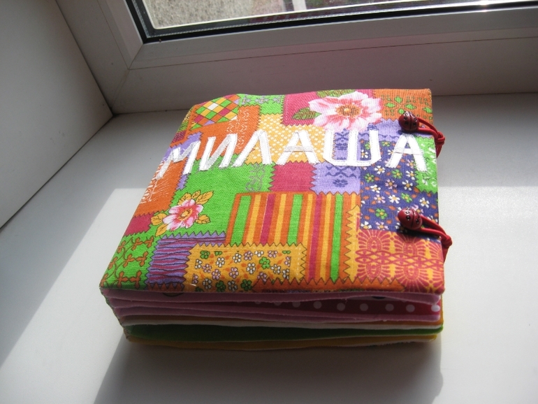 Идея витала в воздухе... Обычную книжку я сшить не успевала (фетр ещё ждёт своего часа))).Сделано всё просто -разложила 2 комплекта платочков (по 6 штук), проклеила дублерином, выбрала пришивные детали по сюжету (пуговицы, липучки, кнопки и т.д.).Потом сшила вместе по два, вывернула, вставила кусок термосалфетки (толстой, как раньше продавали). Планировала сделать переплёт, как у всех,но платочки были уже с каймой и окантовка не подходила. Пришлось помучиться . Купила ленты в цвет и сшивала их со страницами (готовый лист, как карман- двойной свободный край. к одному краю прикладывала ленту (лицом к лицу), по изнанке сшивала. затем к другому краю ленты пришивала один край следующего листа и т.д. последний лист к обложке пришит потайным швом вручную).Застёжка на круглую резинку +пуговицы.