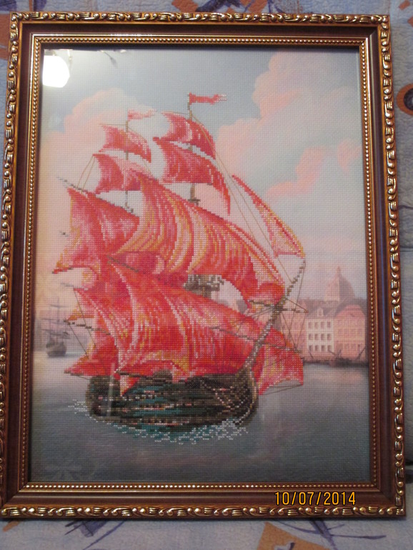 Я в него влюбилась сразу как увидела. Хомяк мой, конечно, потребовал купить, еще бы, кораблик же к исполнению желаний, а их у меня ой как много. Производитель "Риолис", размер 30*40. Вышивается только парусник, весь остальной рисунок нанесен на канву. Вышивался достаточно быстро, одно но, очень близкие по цвету оттенки розового, что не очень удобно при вышивке.