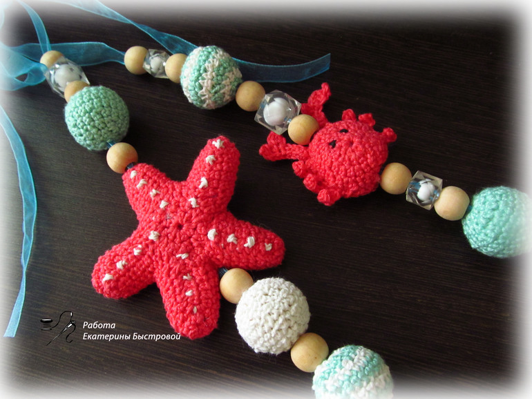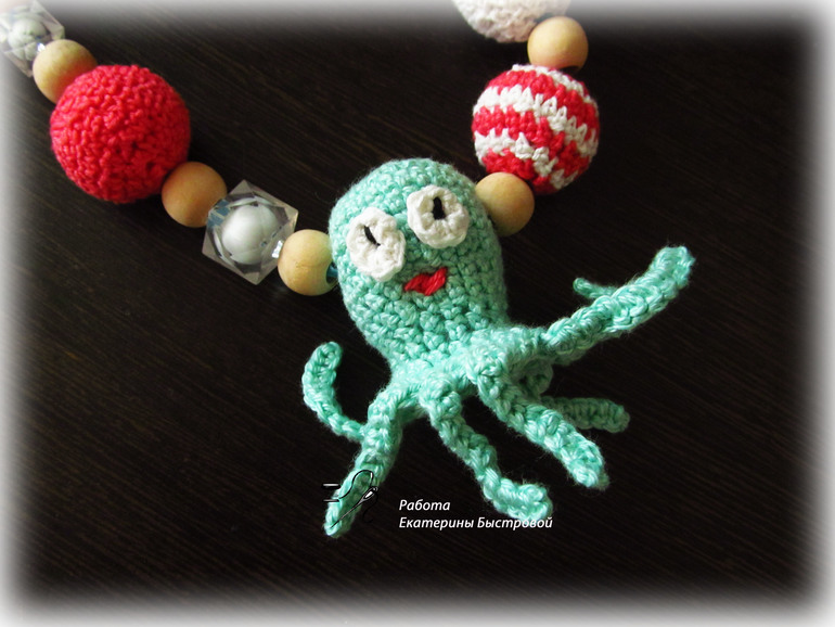 Всем добрый день! На этот раз вдохновилась я слингобусами, пересмотрела много разных, и, конечно, зацепила меня морская тематика как одна из любимых. Потрудилась один день и вот! Бусины натуральные деревянные маленькие и большие, нитки-хлопок (отлично потратила остатки), белые бусины пластиковые от старых рваных бус, игрушки набиты синтепоном. нанизано на ленту из органзы.