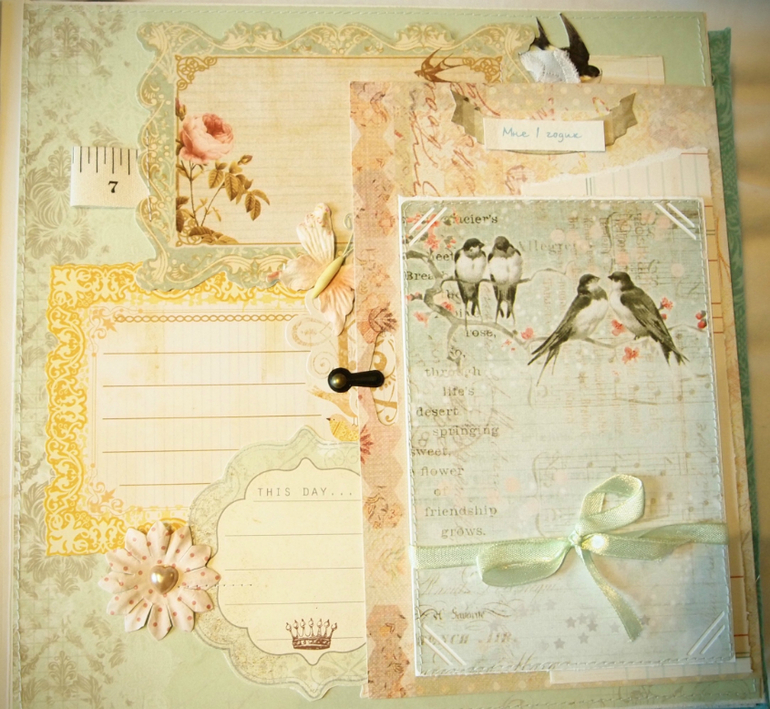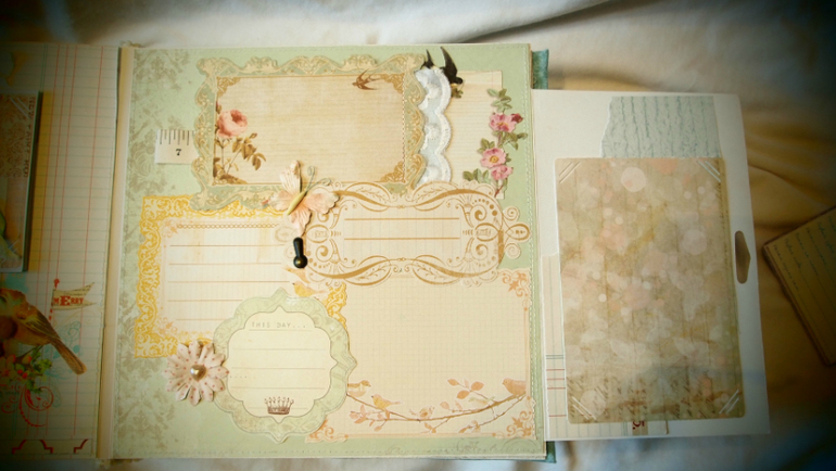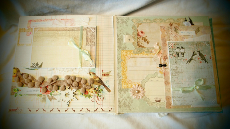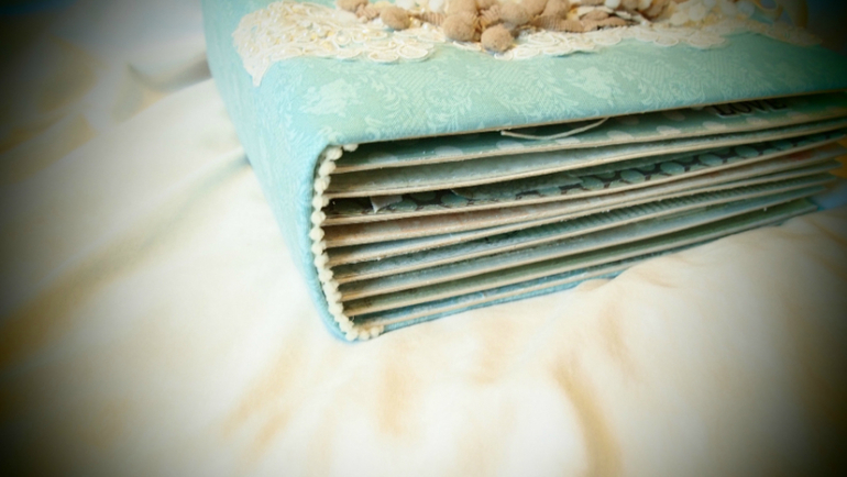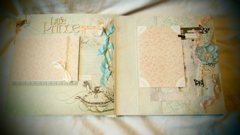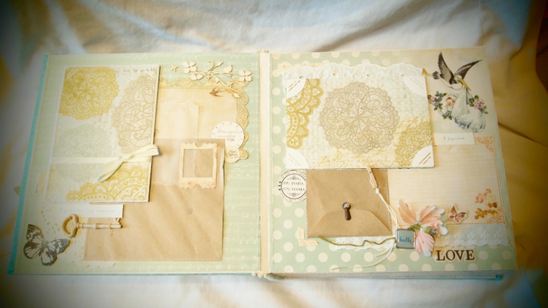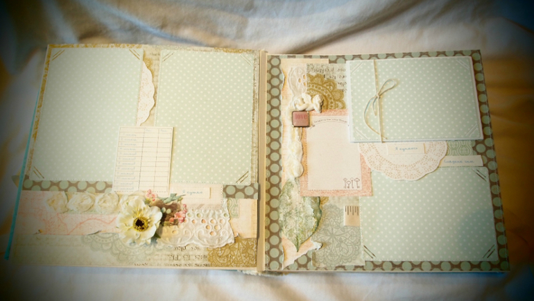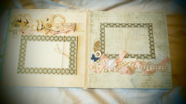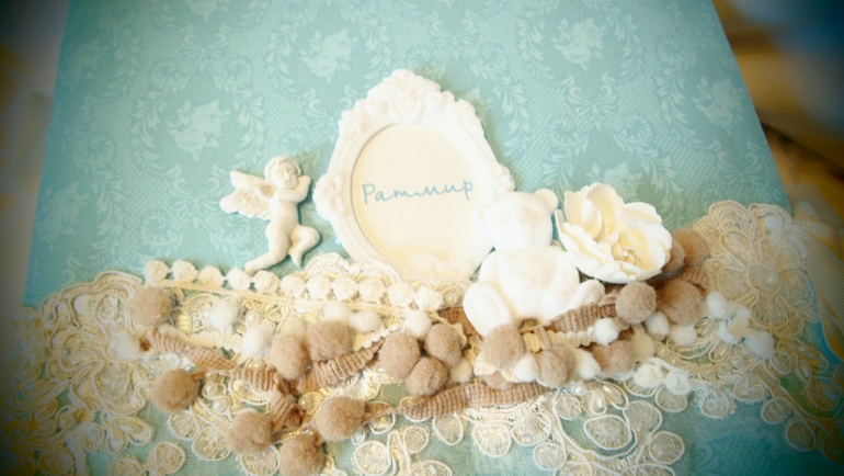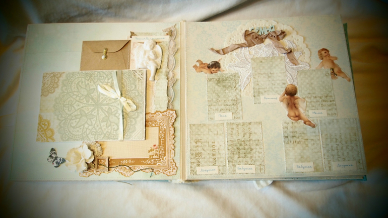 СкрапбукингПривет. Хочу показать вам работу над которой трудилась эти полторы недельки. Большой 25на25 формат, на 18 стр, вмещает около70 фото(10на15 и 9на13)+ маленькие. Обложка мягкая,ткань тильда, на обложке итальянское кружево,розшитое бисером и паетками вручную). Альбом выдержан в мятно-бежево-голубых оттенках.Смотрим