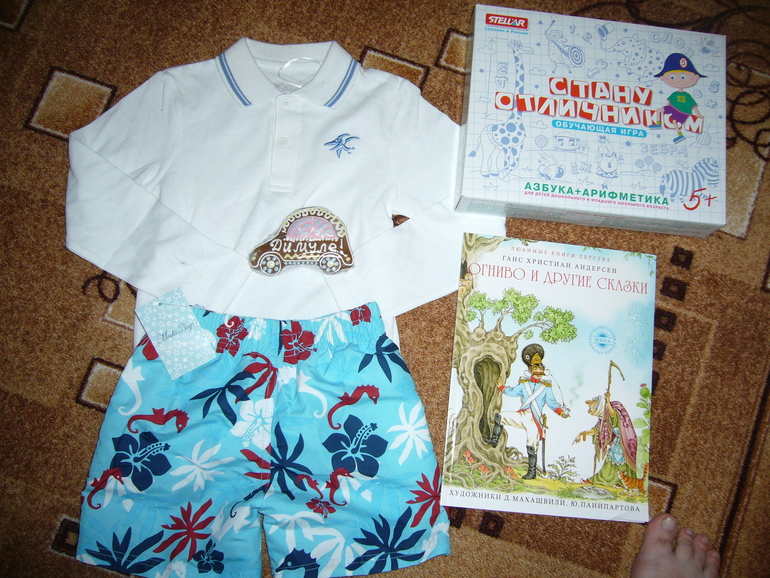 Теперь ,подарки для Димки.Игра-развивашка,книжка,шортики и кофточка. Все очень красивое!!!! Танюш,ты такая заботливая...,Спасибо тебе!!!!