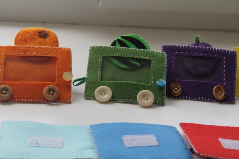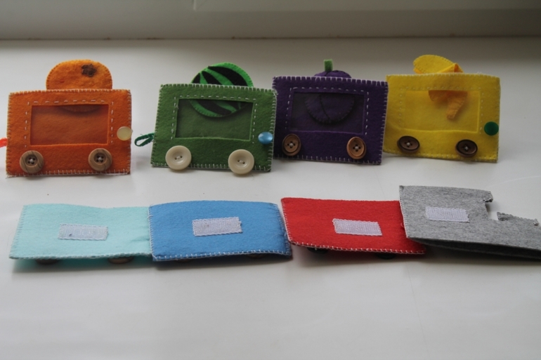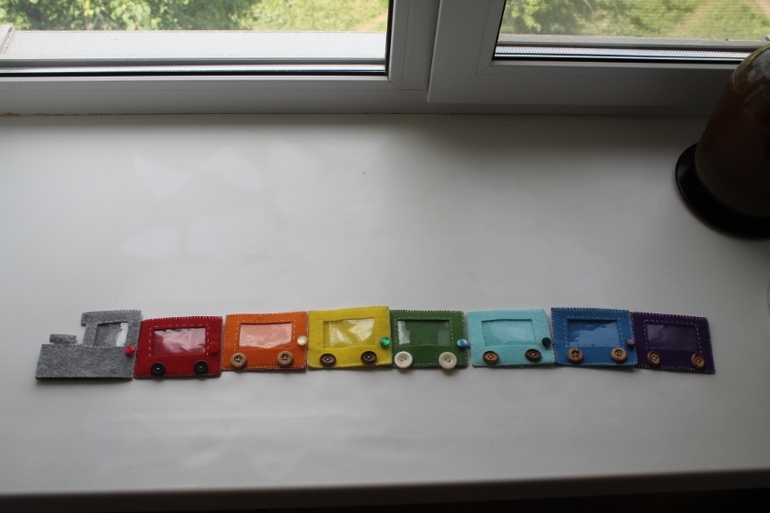 Итак, вагоны я сделала большие и все с прозрачными окошками, все вагоны на липучках, внутрь вагончика можно вложить все что поместиться, это и рисунки и плоских игрушек, ( в будущем планировала изучать с дочей дни недели) вагонов получилось 7, они друг с другом крепятся на пуговки. Ошибкой было использовать разноцветные ленточки они мохряться. На пуговки на каждом вагоне должны быть колеса. А так в целом ничего. Вставляли наши фотки в вагоны и ехали на море)))