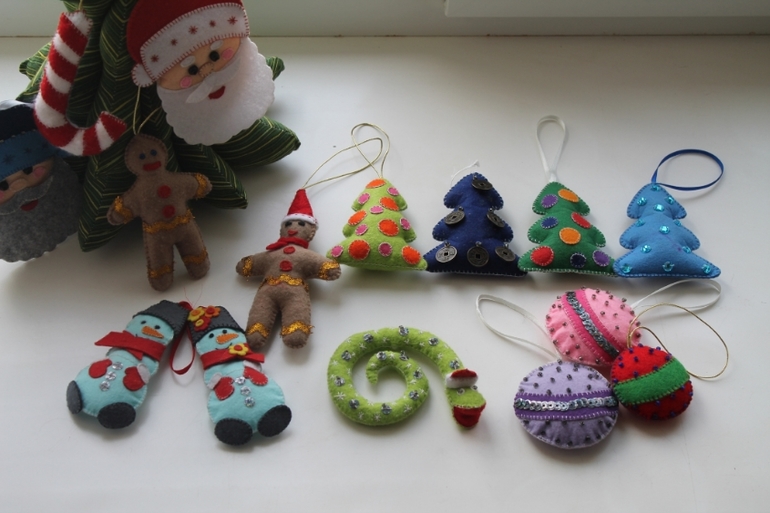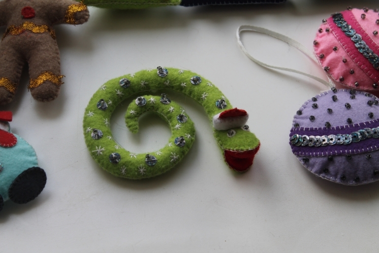 ФетрЖаль, что Новый год подкрался незаметно(в принципе как и каждый год) и многое не успело с бумаги перевоплотиться в фетровую игрушку. И как приятно видеть как твоя роднулечка наряжает елку, игрушками, которые ты сделал сама, конечно же в первую очередь для нее, для той самой роднулечки. Год змеи, змейки, елочки, деды-морозы, снеговики, шарики, печенье, и конфеты, конечно идеи были взяты отовсюду и из интернета, из мультиков, журналов. Если кто-то узнал похожее что-то, сразу говорю на авторство идеи не претендую, но все выкройки рисовала сама. Думаю что когда долго занимаешься копированием, в итоге рождается что-то свое, только твое.