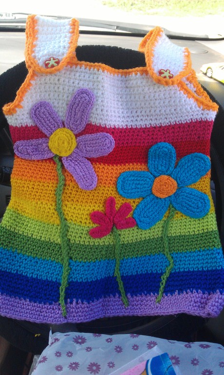 а это рукоделочки подарочки для моей крестницы, муж сфотал в машине по моей просьбе, т.к практически сразу подарил подарочки от феи нашей. Вся семья в восторге!!! А когда я вживую увидела сарафан,я пожалела,что он не мне:) Такой волшебной красоты он! Сочный - по настоящему летний!!!!