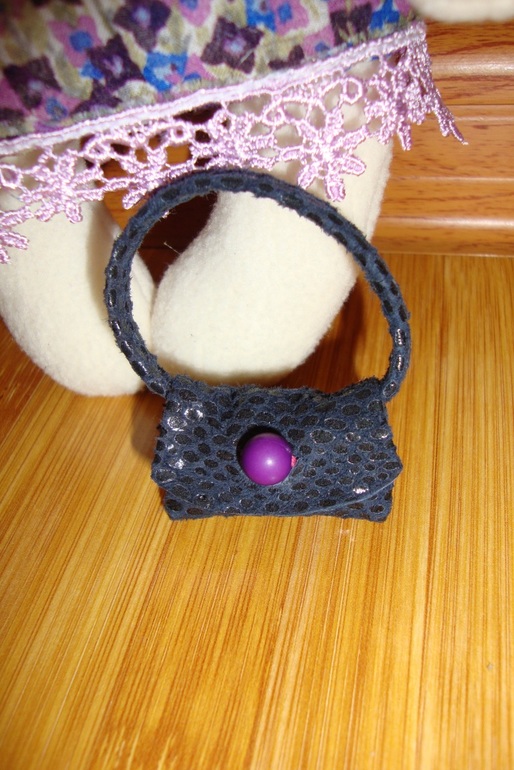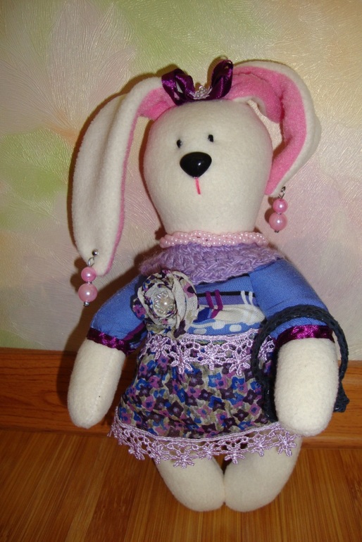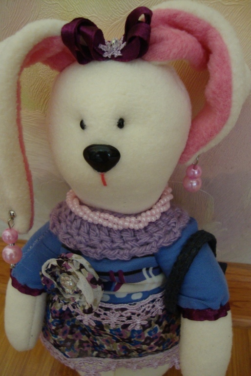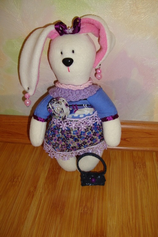Дальше идет "Хулиганская модница", эта зайка, любит красивые наряды и сумочки из натуральной кожи, а еще она большая сладкоежка, поэтому в сумочке у нее всегда лежит конфетка для повышения настроения. брошь-цветок съемная
