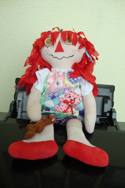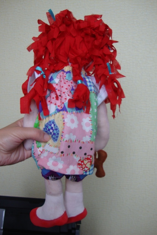 А это маленькая девочка Эмили, которая раньше жила на чердаке, но потом ей там стало страшно и она спустилась к Аришке. Эмили очень любит своего мишку и никогда с ним не расстается, даже на сарафане у нее изображен мишка. А еще Эмили очень активная девочка и всегда хочет убежать, чтобы посмотреть, окружающий мир, и для того, чтобы она не потерялаь на сарафанчике у нее есть маленький колокольчик, который всегда скажет где Эмили.
