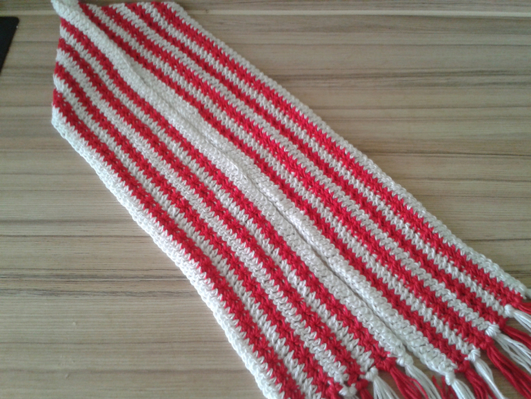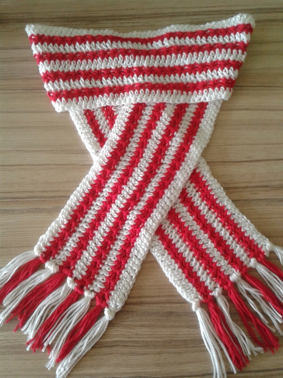 Вот первый. Пряжа - микрофибра Magic (красный цвет) и бриллиант Vita (белый). размеры шарфа 114 * 12 см (без учета длины кистей).