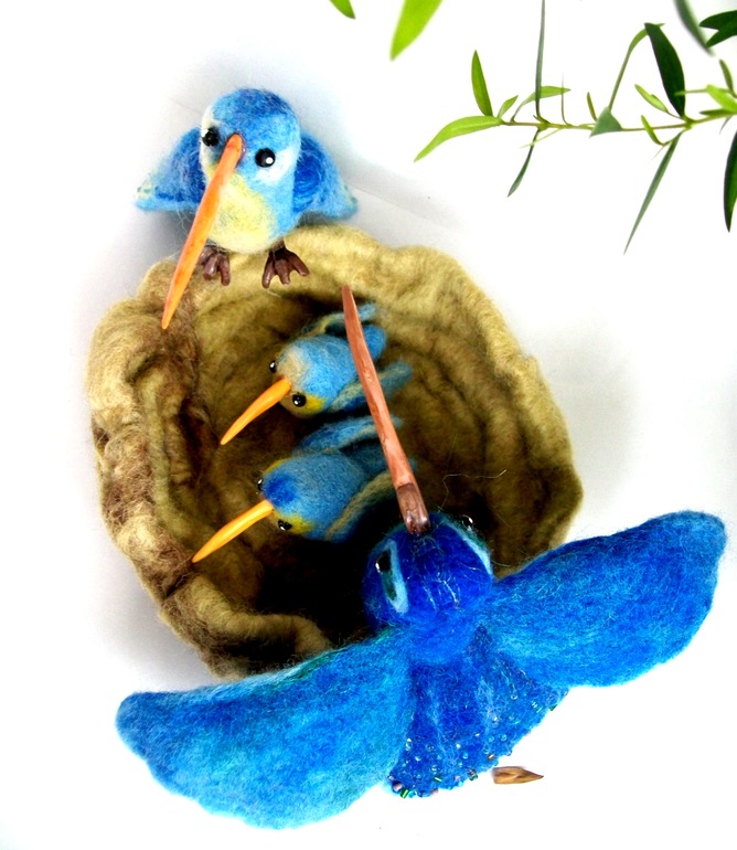 Крылышки немного расшиты бисером. Гнездышко выполнено в технике мокрого валяния.