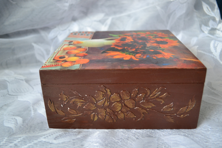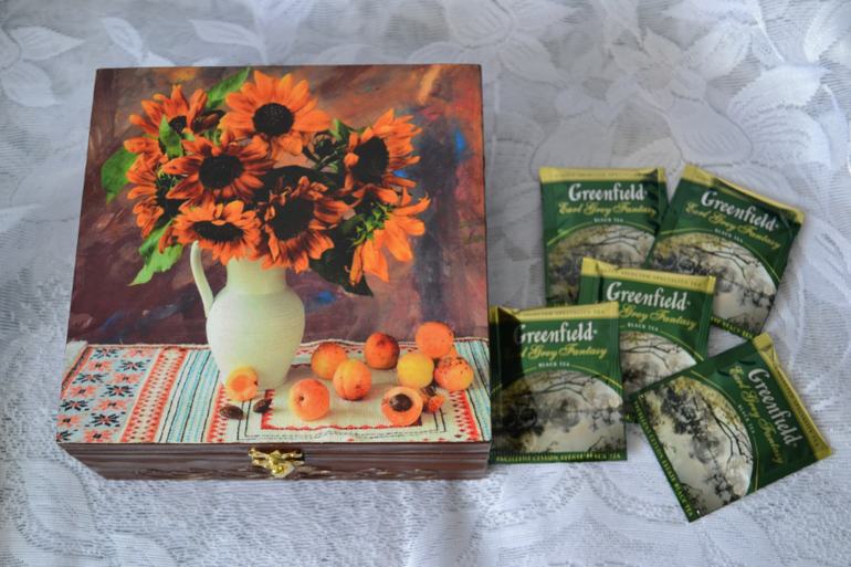 ДекупажА я с шкатулочкой для чая, захотелось яркого, летнего и вот она...