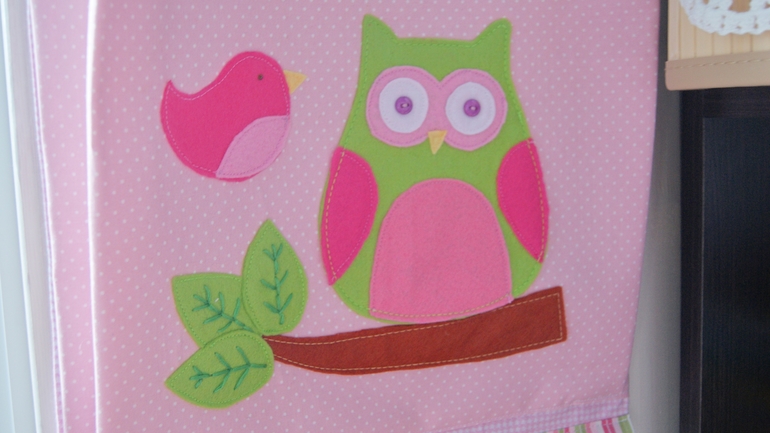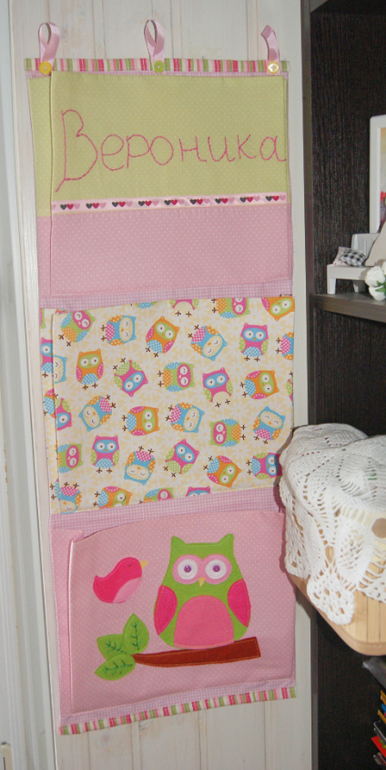 На самом верxнем кармашке имя xозяйки органайзера. Вышила имя нитками мулине, скомбинировала карман из 2x тканей, и украсила лентой в сердечку