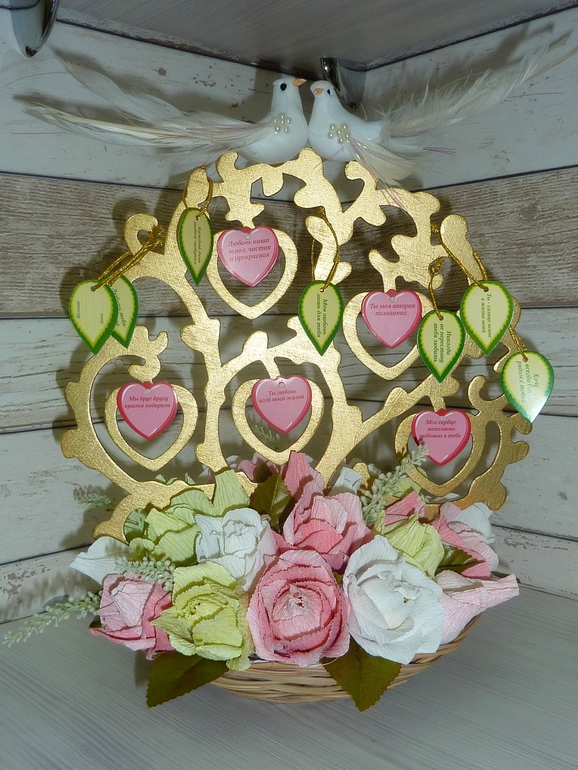 Здравствуйте дорогие рукодельницы! Заказчики захотели подарит молодожёнам деньги, но оригинальным способом. У меня родилась идея денежного дерева с пожеланиями и конфетами. Свитки с деньгами крепятся к веточкам. Заказ был срочный, за 1 день. Я попросила 1300 за работу, начиная с разработки идеи, покраски и конфетного букета. Я не дорого за работу прошу? Во сколько бы вы оценили этот подарок?