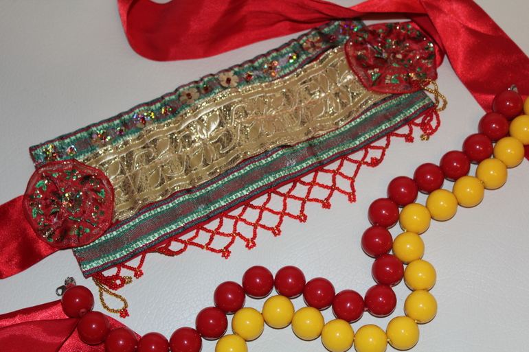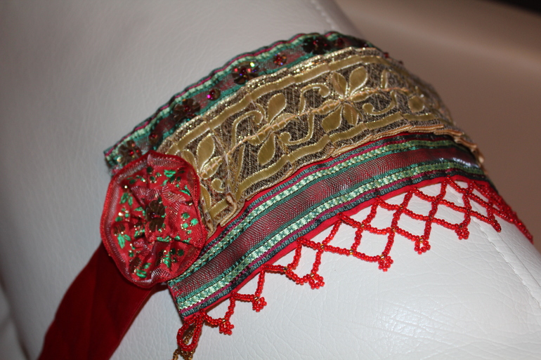 Отдельного фото косыночки нет - это обычный треугольник из парчи, а сверху завязываем вот эту повязочку с бисерной навеской, и получается такой комплексный головной убор, здесь на фото лучше видно.