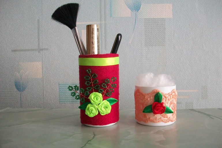 Увидела в интернете интересную идею по декорированию баночек и сделала свои. Розочки тоже делала сама. Строго не судите, делала впервые.