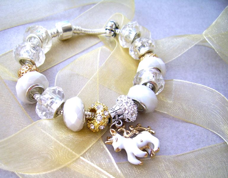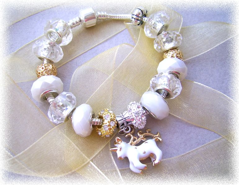 Браслет "Единорог для Принцессы" выполнен в бело-золотых тонах. Браслет искрится за счет граненых бусин и выглядит очень нарядно. Благодаря сочетанию классических цветов браслет гармонирует практически с любой одеждой.