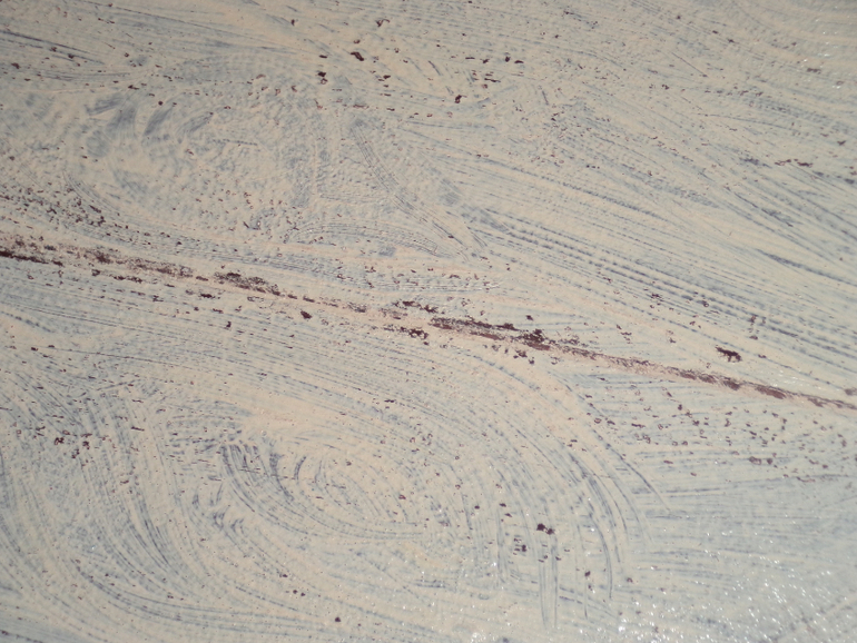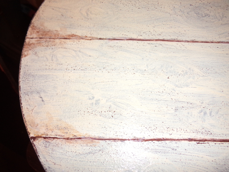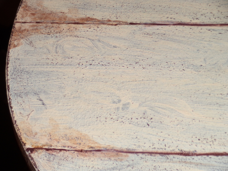 4. Теперь в ход пошла жесткая наждачка. В тех местах, где натирала свечкой, прошлась наждачкой, содрав слой белой краски. Создала так сказать потертости