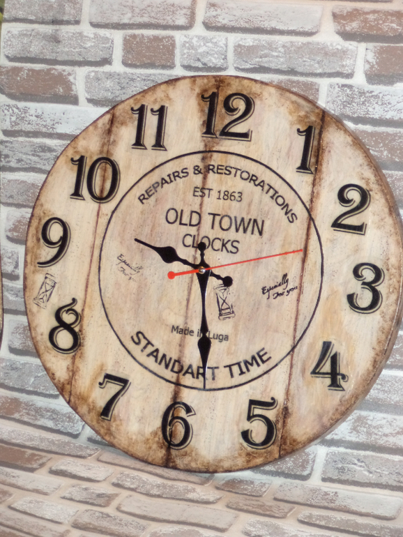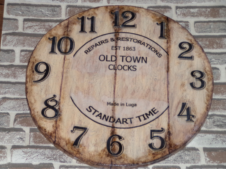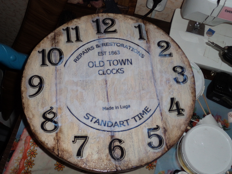 Материалы: Деревянная заготовка, акриловый грунт, акриловые краски, акриловый лак для бань и саун, распечатка на принтере, часовой механизм, битумный лак, шкурка мелкая и чуть покрупнее