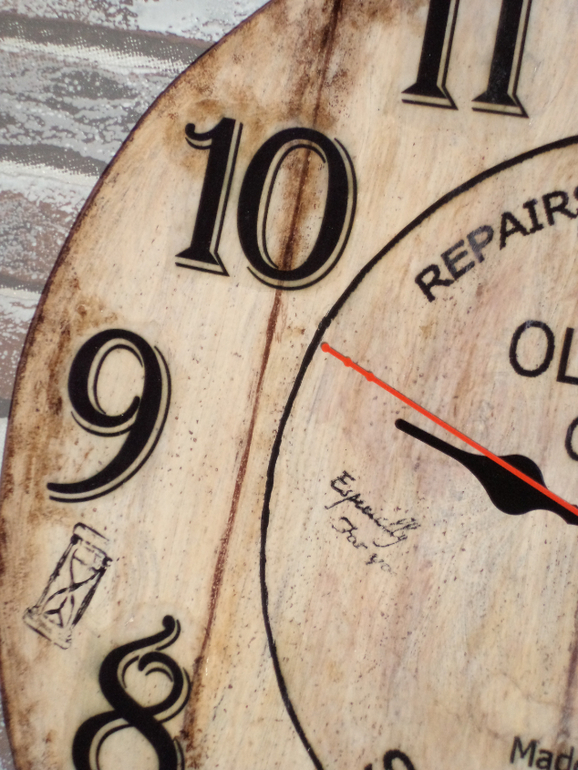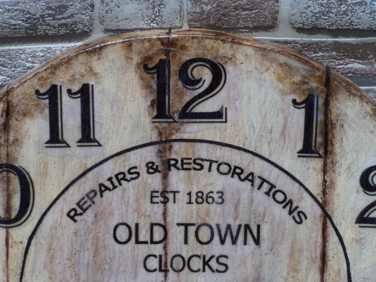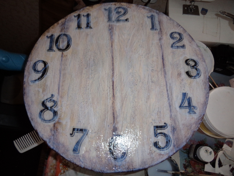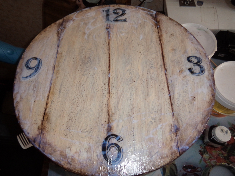 После приклеивания цифры все же чуть изменяют уже ранее созданный фон часов, поэтом нужно снова пройтись краской или битумом особенно по темным местам, чтобы сравнять с общим фоном