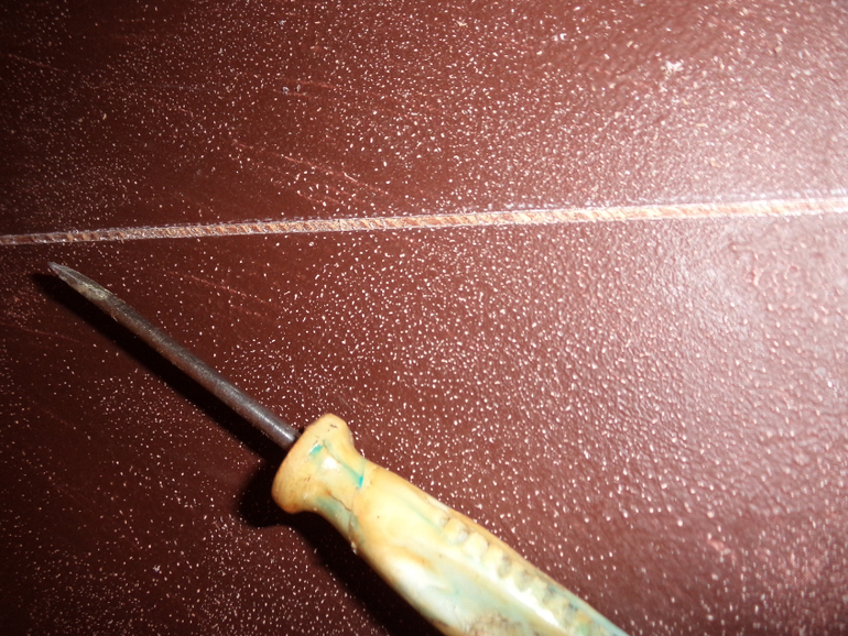 2. После того как грунтовка высохла, покрыла коричневой краской. Она будет просвечивать через основной слой через потертости. И после того, как краска высохла отверткой наметила края досочек. Прям соскребла, сделала небольшие углубления.