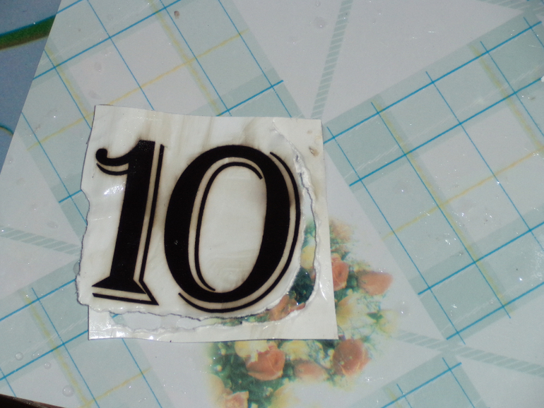 7. Теперь распечатала на струйном на фотобумаге. Нанесла 4-5 слоев лака. тут меня поджидал сюрприз. Наверное от нетерпения. Когда стала покрывать лаком цифры, изображение потекло. Распечатка была совсем "свежая" и видно краска еще не высохла как следует. Но в моем случае черные разводы играли мне в плюс. если вам они не нужны то лучше занимайтесь распечаткой на следующий день. После того как все хорошенько высохло, вырвала цифры из общего фона