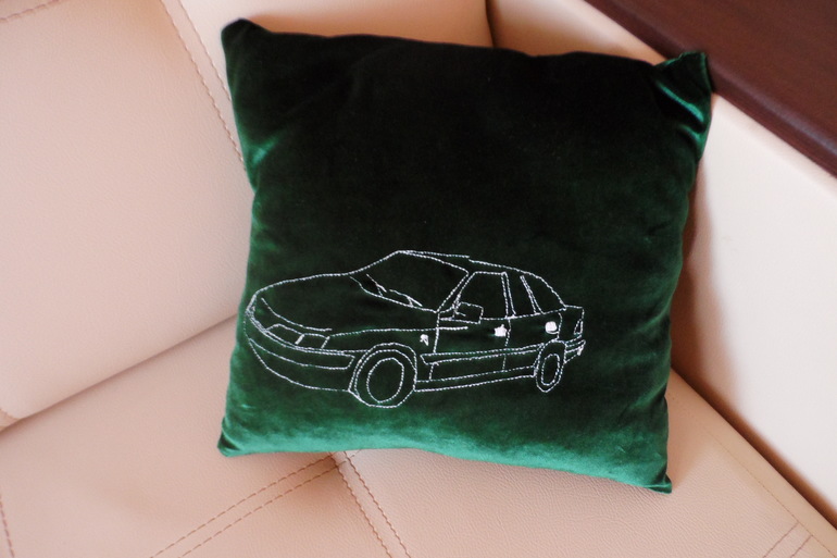 Шитье одежды, выкройки, ремонт одежды, шторы, швейные машины (уже приобретенные)Сшила мужу в машину подушку с логотипом. Даже цвет ткани подвернулся похожий!