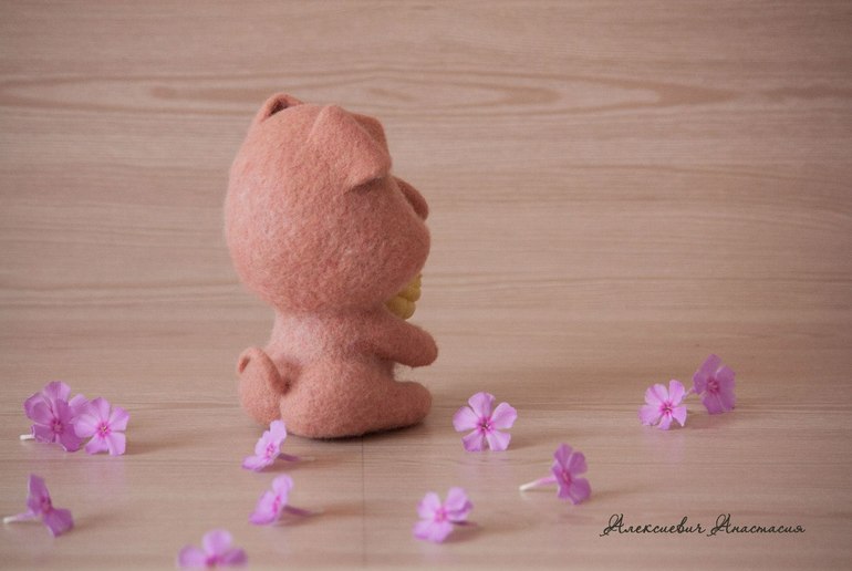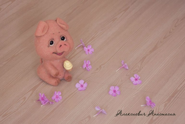 Свалян поросенок из шерсти отечественного производства, распушен иголочкой с обратным ходом, тонирован пастелью, размер около 15 см.