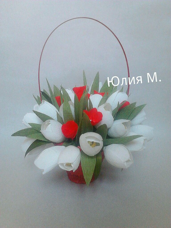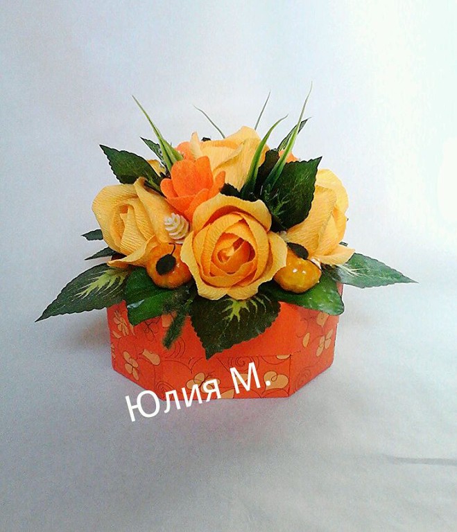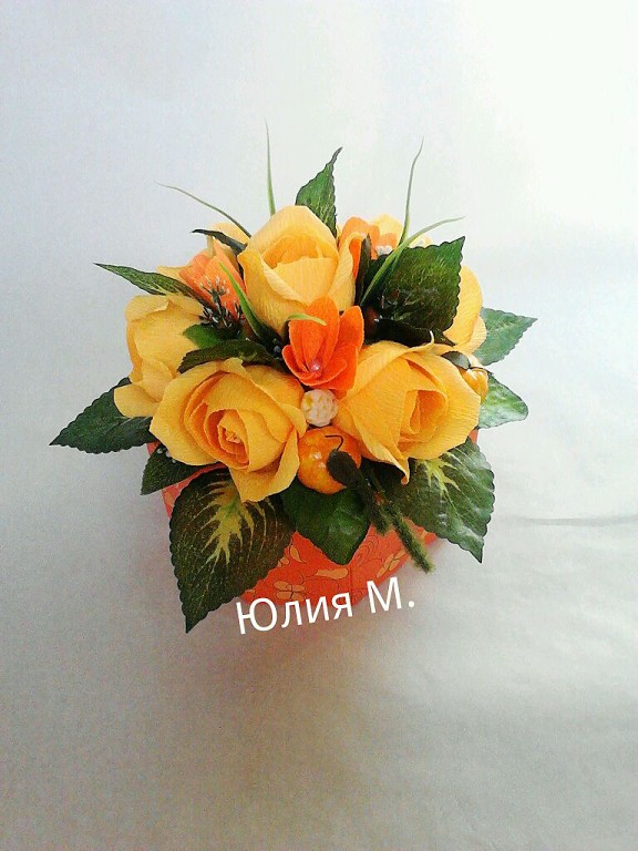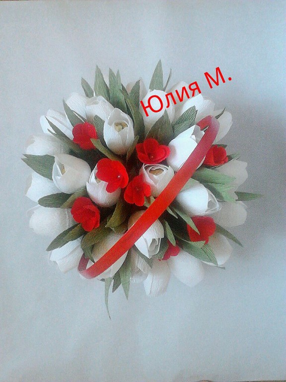 Тюльпаны белые как настоящие и нежнее нежного! А на последнем фото, я не поняла, что за чудо-зверь, интересно очень))) Юля, а как Вы коробочку оранжевую оформили, прямо к коробочке цветы приклеили или там основа? Все хочу украсить коробочку конфет, но не знаю как к ней подойти. Если не трудно, научите пожалуйста)