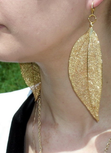 Стильный кулон и длинные оригинальные серьгие "Натуральный лавровый лист позолоченный".