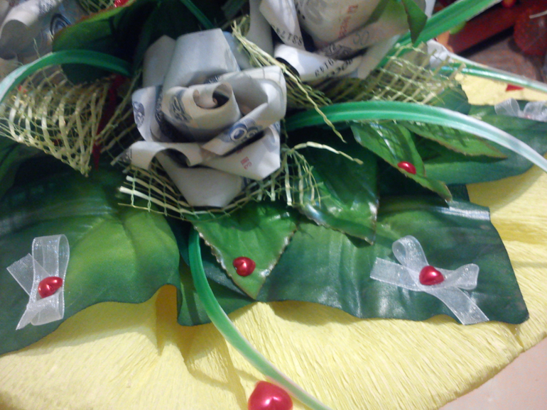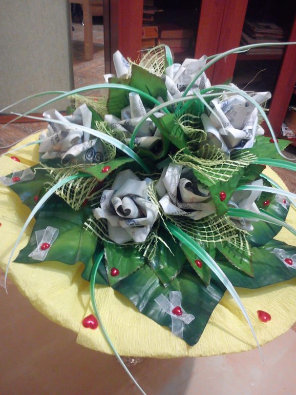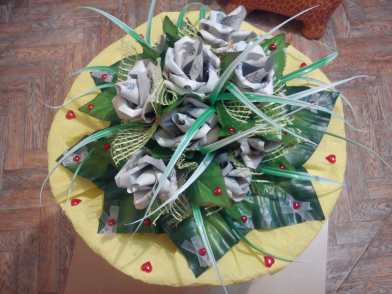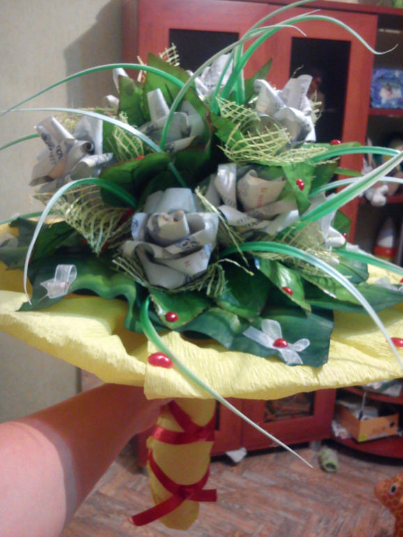не из конфет,но вроде тоже букет))))завтра идём на свадьбу,и у меня получился вот такой вот подарок