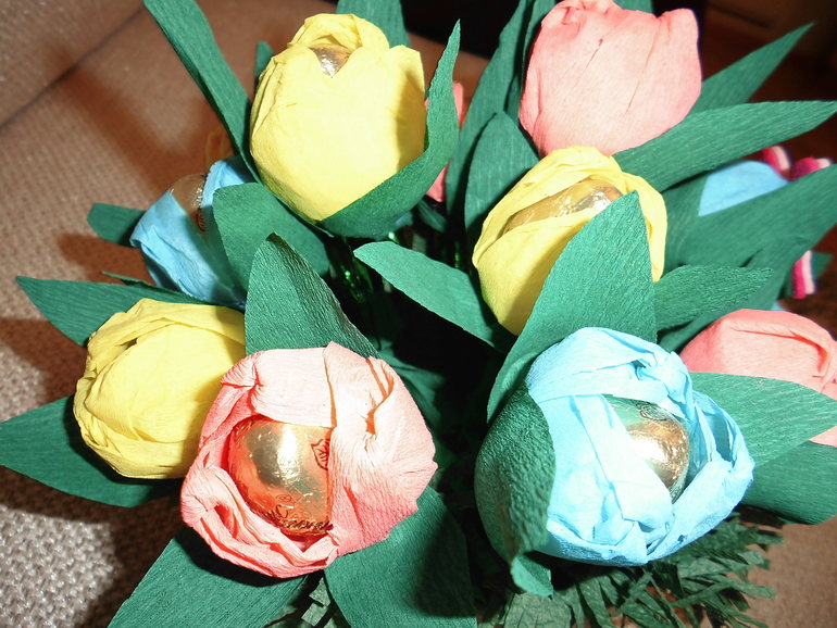 Очень мне нравятся букет конфетные. Первый раз сделал, когда подарка серьезного не было (были финансовые затруднения). А теперь стараюсь совершенсвовать свое мастерство, но... Без хороших материалов трудно сделать качественный букет. Пока обхожусь обычной гофрированной бумагой из канц.товаров. А где лучше покупать хорошую бумагу? Только не сильно дорогую