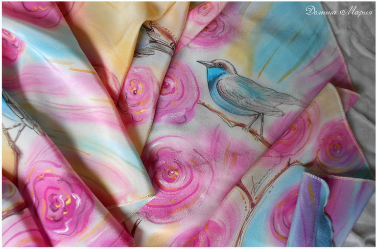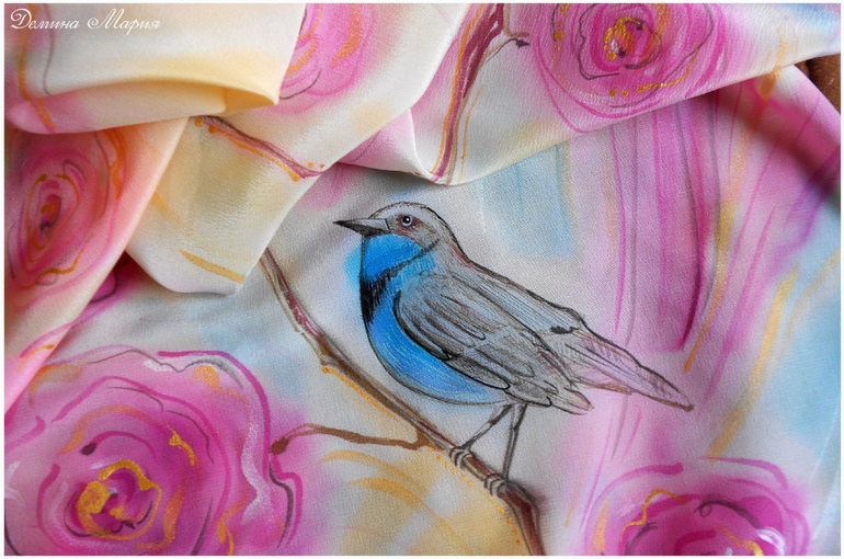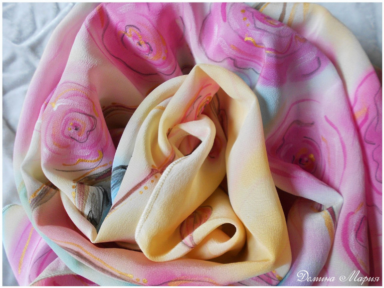 Роспись выполнена на крепдешине (100 % шелк) паро- и термозакрепляемыми красителями.Свободная роспись.