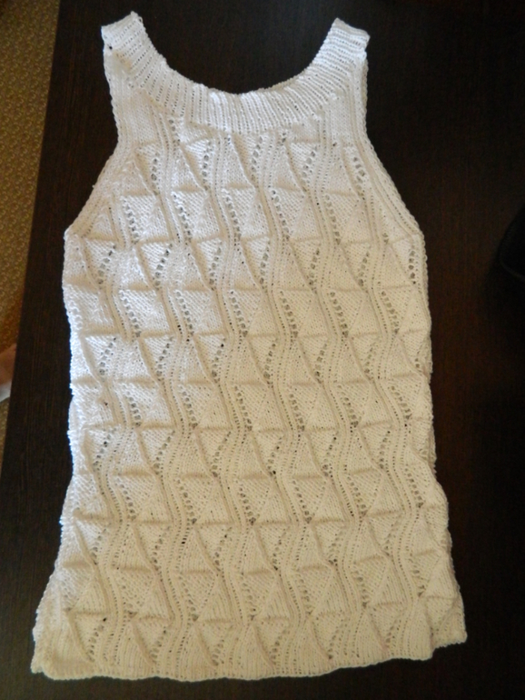 Прошу обратить внимание, что в схеме ошибка. Там накиды с 15 ряда должны идти вдоль скрещенных лицевых петель, как и до 15 ряда, только с другой стороны рапорта. Если вязать по схеме, получится не так, как задумано =) при чем я случайно по интуиции правильно вязать начала, не глядя на схему =) И еще по схеме словно даны пояснения для вязания по кругу — там, где две лицевые петли вяжутся вместе в рисунке, нужно учесть, что наклон должен быть вправо, чтобы узор красиво лег =) надеюсь, понятно ))Ну и последнее — я вязала из 100% мерсиризованного хлопка — так мне посоветовали в магазине. Но мягкая на ощупь эта ниточка только в клубке. Не в первый раз убеждаюсь, что для подобных вещей нужно выбирать самую воздушную ниточку, легкую, но не слишком тонкую =) указанной в описании у нас нигде нет.. =(