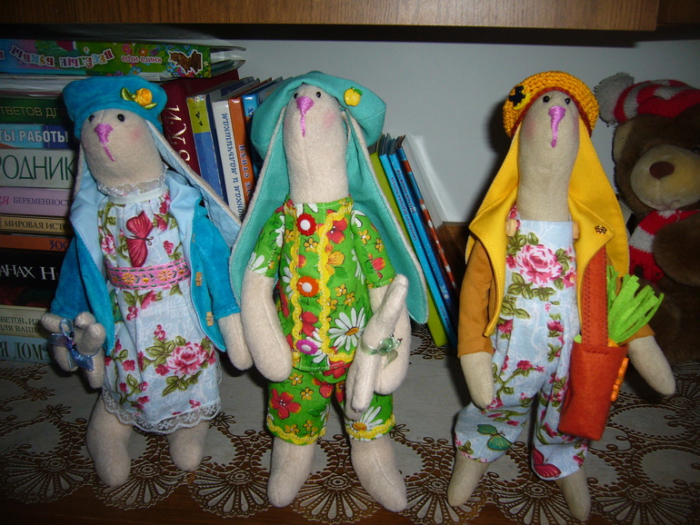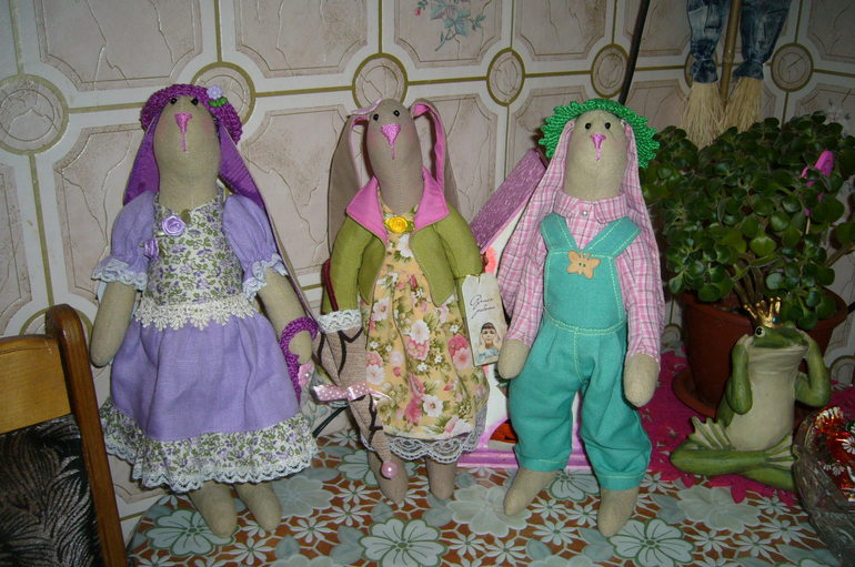 Сегодня сидела,разбирала старые фотографии и наткнулась на эти. Этих зайчиков я шила уже давненько, по обменам с девочками с бб , а так же для себя,по вдохновению.Это те редкие снимки,когда игрушки еще не отправлены по посылочкам и не разъехались по новым домам.Они такие родные мне...Будто это и не игрушки вовсе из ткани и наполнителя...А какие-то живые создания ,потому что когда их создаешь ,то в каждого вкладываешь частичку своей души.Живут сейчас в разных новых семьях...Сколько же я их сшила?И не только зайчиков? Надеюсь радуют своих новых хозяев,а их новые хозяева, иногда, может вспоминают меня добрым словом....)))))))