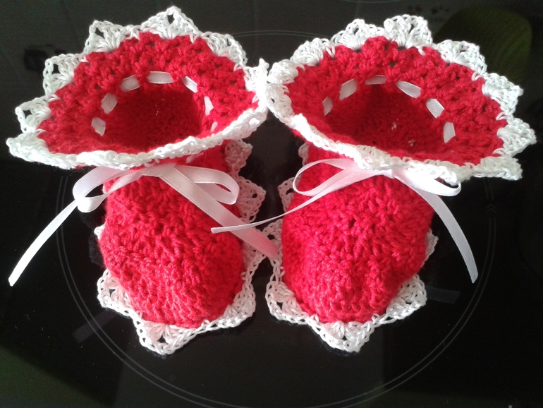 Последний ряд красной нитью арочки из 5 ВП над каждым столбиком.Теперь про красные: подъем — "галочки" (из одной петли основания вяжется ССН+ВП+ССН, далее две петли пропускаем и повторяем комбинацию). Потом белой нитью из ВП у галочки вяжется 3 ССН+3ВП+3ССН, вторую галочку пропускаем, и в третью повторяем узор.надеюсь понятно написала))))