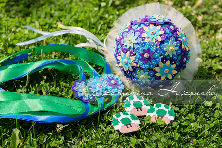 И вот наконец показываю вам результат своей работы - букет из фетра - диаметр 20см (с фатином), аксессуары для подружек невесты и аксессуары для друзей жениха в виде грибочков.