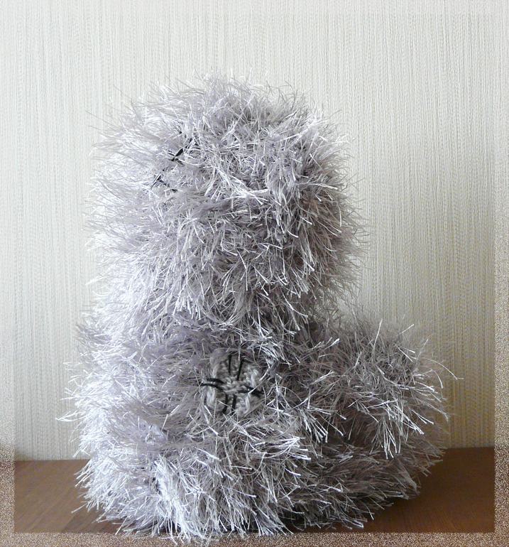 в основном спицы и немного крючком, в высоту в сидячем положении получился 26 см.