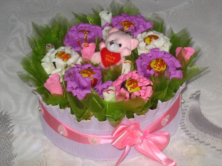 Пред история такова: изначально не планировала я торт. Дочку пригласила на День рождения подружка, которой исполнится 5 лет. Решила сделать ручной букетик на шпажках для барбекю с конфетами "чупа-чупс". Но у меня не получилось его красиво сложить, а по спирали не пойму как это. В итоге опробовала недавно купленный пеноплекс и "испекла" торт))