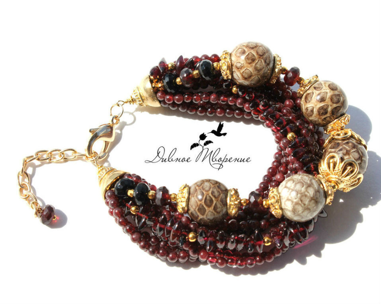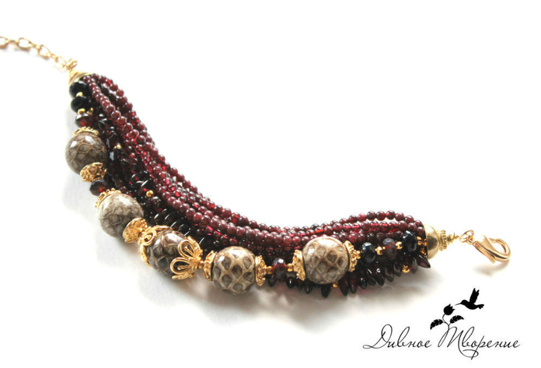 Браслет из натурального граната и бусин ,обтянутых змеиной кожей,позолота.