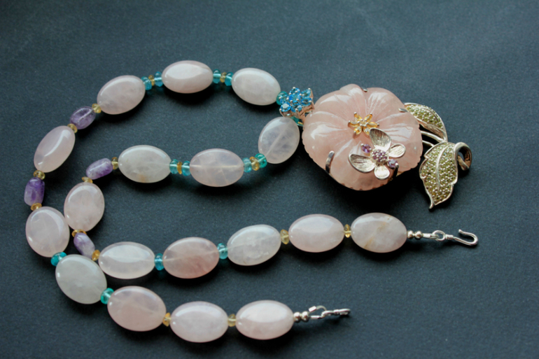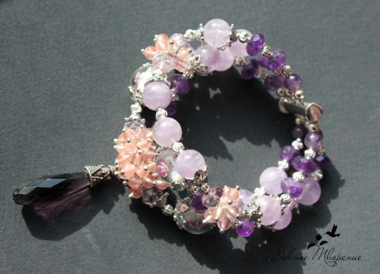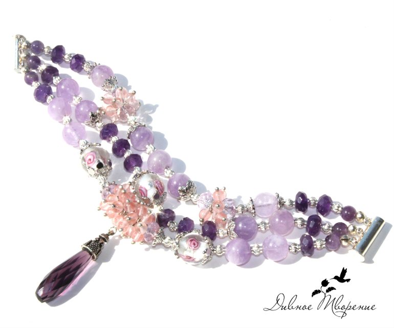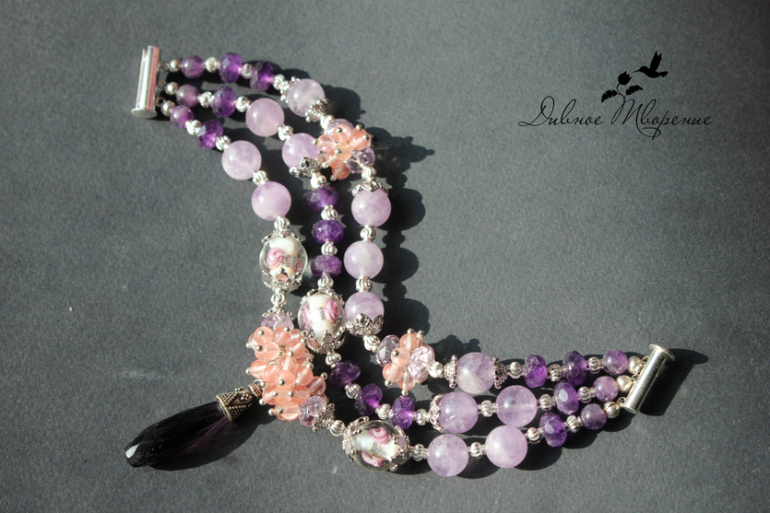 многорядный браслет из аметистов,природных розовых кварцев ,посеребрение