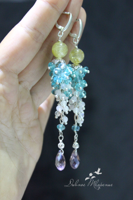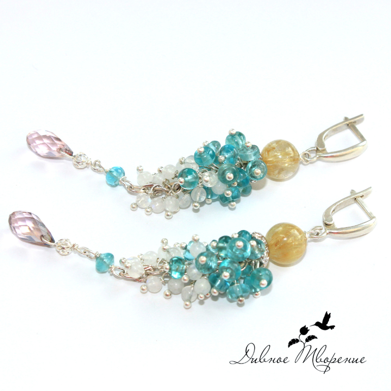 Серьги грозди из апатитов,лунного камня и роскошного кварца" Волосы Венеры".Швензы - серебро 925 пр.