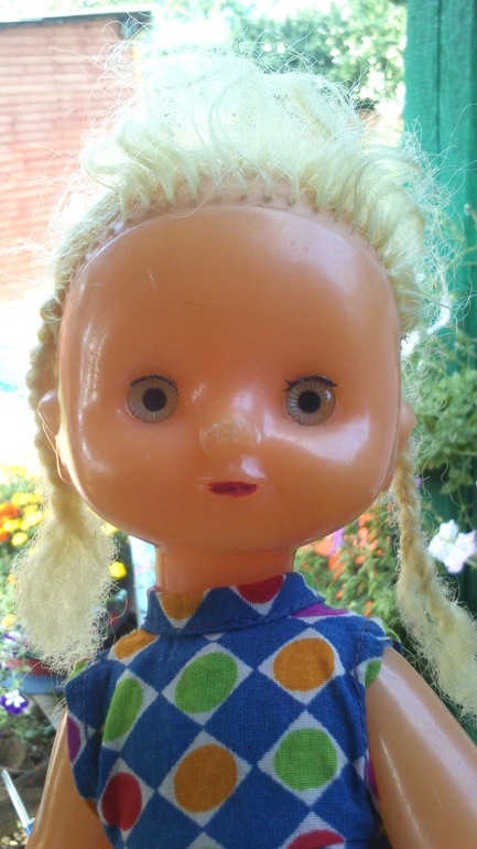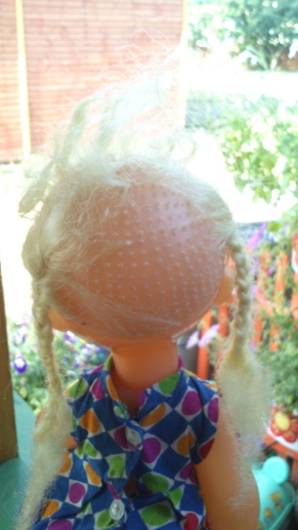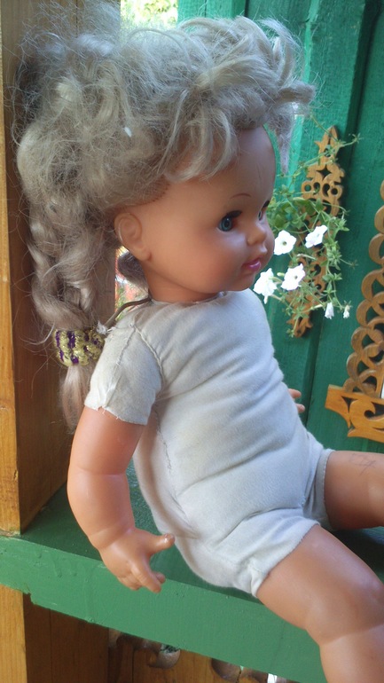 А эта девочка наоборот с залысиной, но скальп снимается. Так что с нитками проблем быть не должно. Какого цвета??? И что сделать с личиком, особенно с носиком (он явно кем-то сЪеден )))
