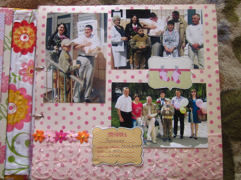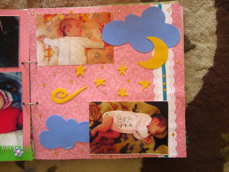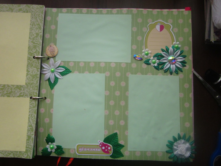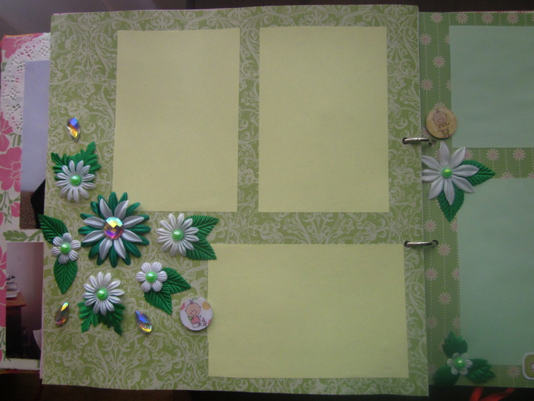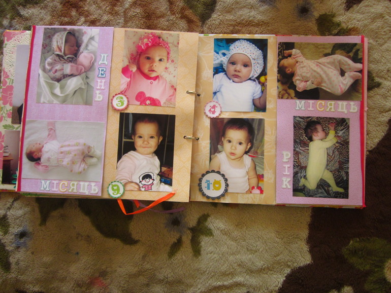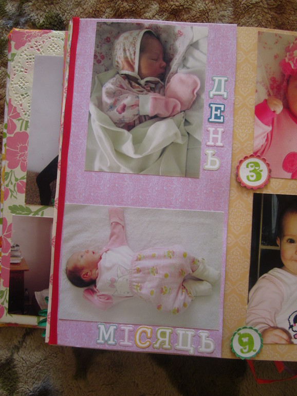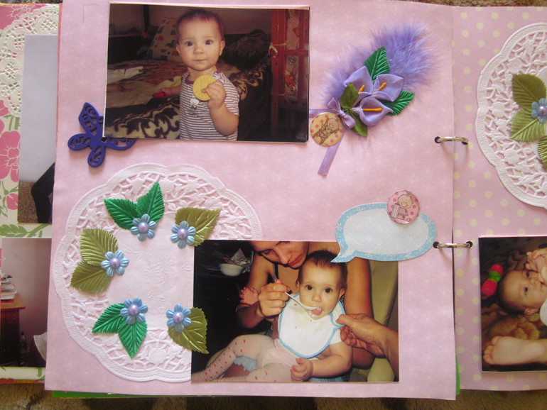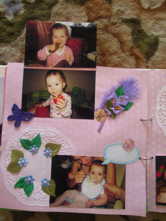 СкрапбукингЗахотелось сделать доченьке такой альбом на первый годик. Раньше ничего подобного не делала(ну разве что книгу пожеланий, но там украшала только обложку, а листы были сделаны в фотошопе), поэтому прошу строго не судить. Под катом очень много фото. Размер альбома 30*30 см, для листов испозьзовала тонкий картон, для обложки - пивной. Бумага из трех разный набора, старалась соединить это все в единое целое. Делала я его почти год(с момента как заказала бумагу, картон и прочее до полного завершения). Ну, это теоретически, а практически(если посчитать именно те дни, когда я его делала), то наверное месяц, не меньше. Сделала две-три страницы, все, фантазия куда то ушла. Через месяц опять немножко сделала и т.д. Когда доченька была еще маленькая и почти все время лежала в кроватке, я раскладывала листы альбома на нашей большой кровати, когда дочка немножко подросла и уже ползала-ходила, раскладывала листы в ее кроватке, чтобы она их не достала.