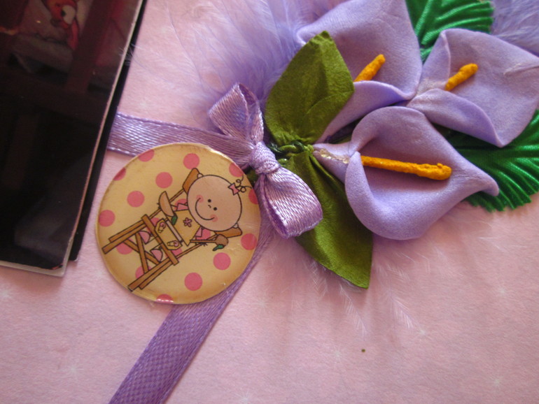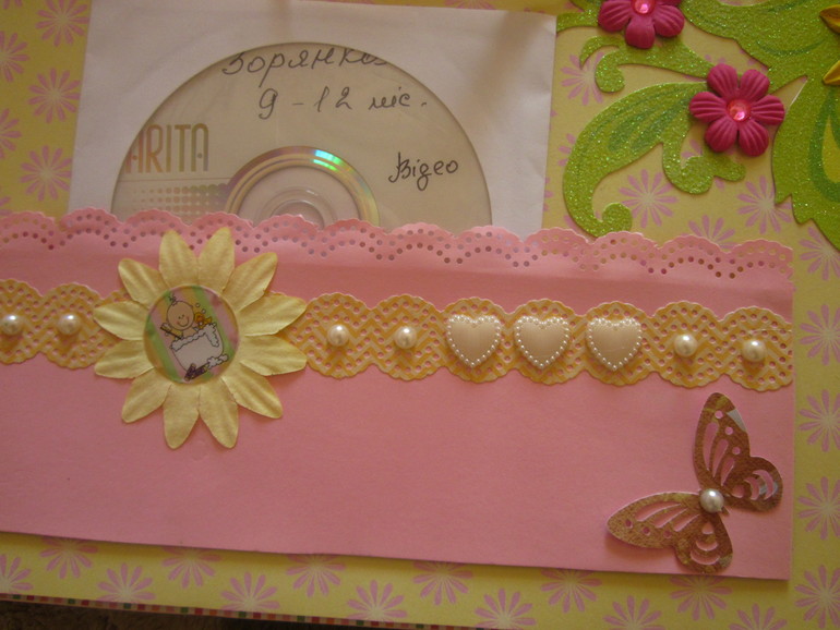 Следующая страничка - Зорянка купается, бантик развязываем и там еще несколько фото и карманчик для диска с фото.