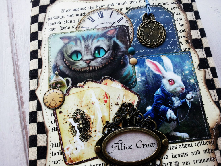 Формат А5, обложка обтянута хлопком, коллаж из картинок из фильма расположен на обожженной "страничке" из книги Алиса в стране чудес.