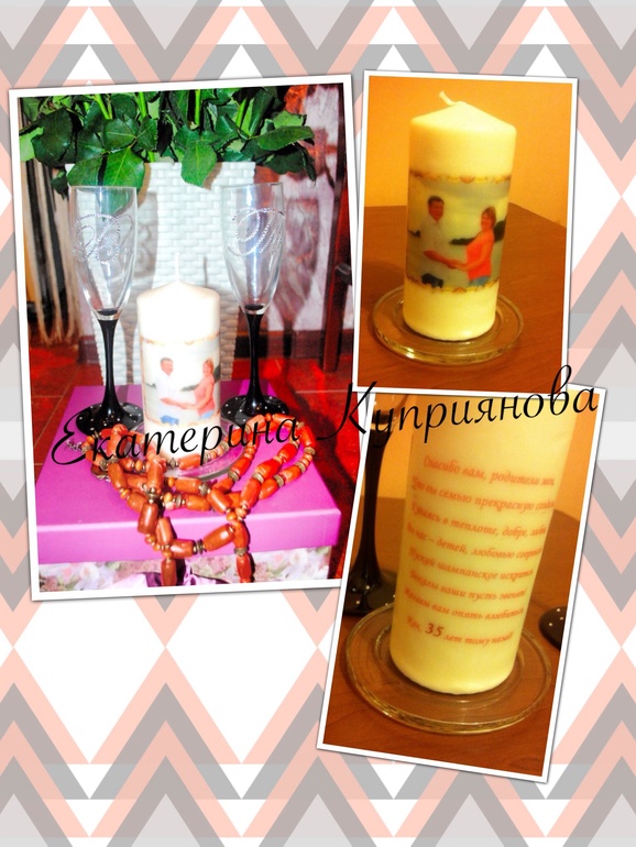 Делала бокальчики и свечку с фотографией на коралловую свадьбу!жалко фото не очень получилось(