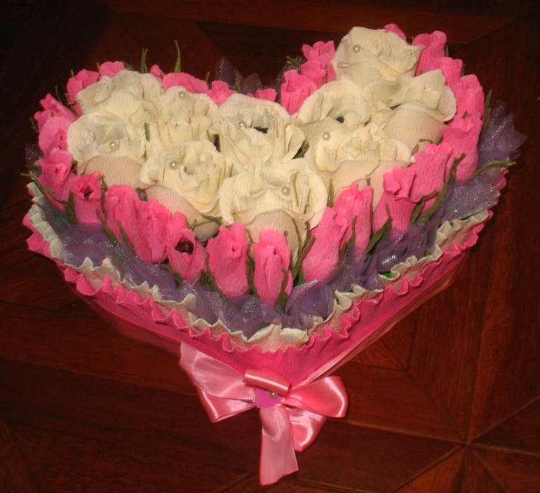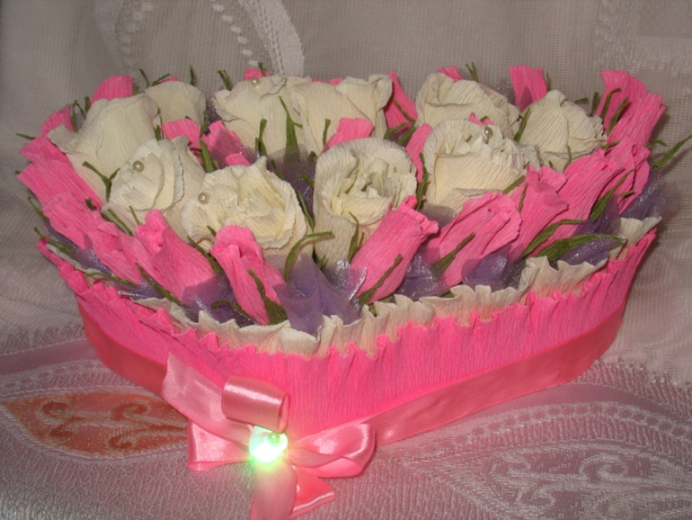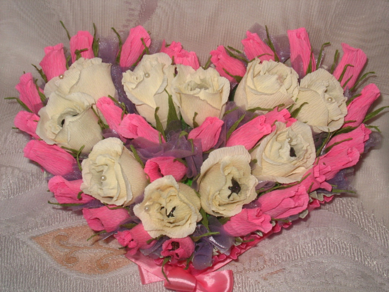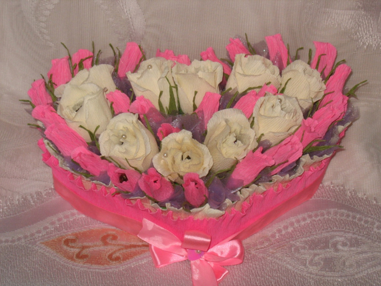 Вроде не плохо, но посадка не удачная. Бутоны слегка под наклон посадить, начиная с верху и вниз уходить, композиция сразу по другому заиграет и белые розы тоже слегка наклонить.