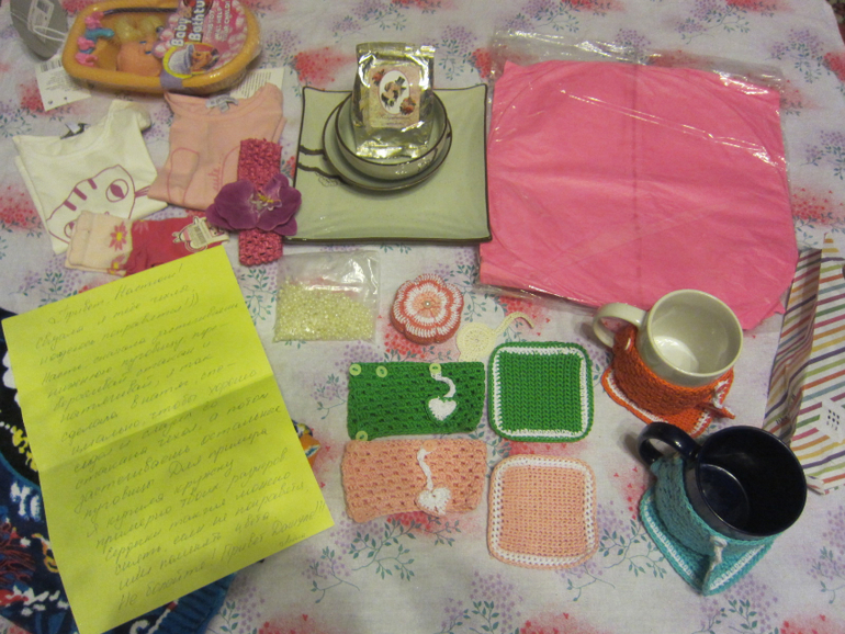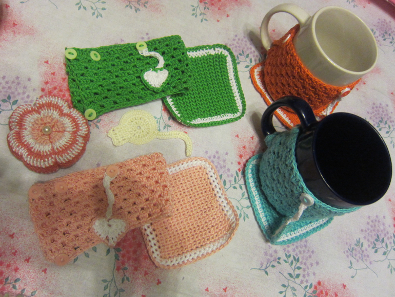 ...от чудесной феечки Алёна .Предметом обмена стали вязаные чехольчики на кружки, они прекрасные!К ним наша фееча связала подвески-сердечки и подстаканники, еще мне досталась милая игольница и заладка для книжки.Ну, обо всем по порядку, с чувством, с толком, с расстановкой.Это общий вид:
