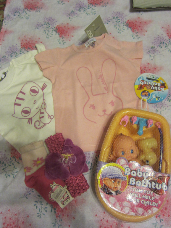 Подарки для Дашунделя: футболочки отличного качества, мягонькие такие, повязочка, носочки и игрушки для ванной (племяшка чуть не отобрала